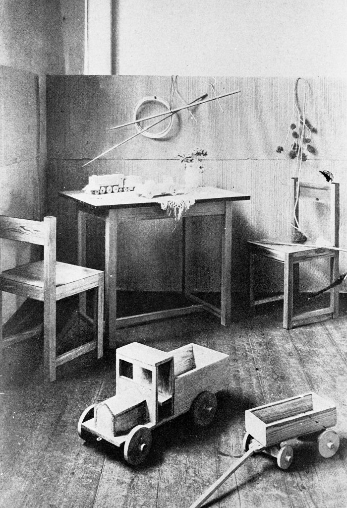 Fragment wystawy wyrobów z drewna. Przedmioty wykonane przez słuchaczy 1. kursu Instytutu Robót Ręcznych pod kierunkiem prof. Kazimierza Zacharkiewicza